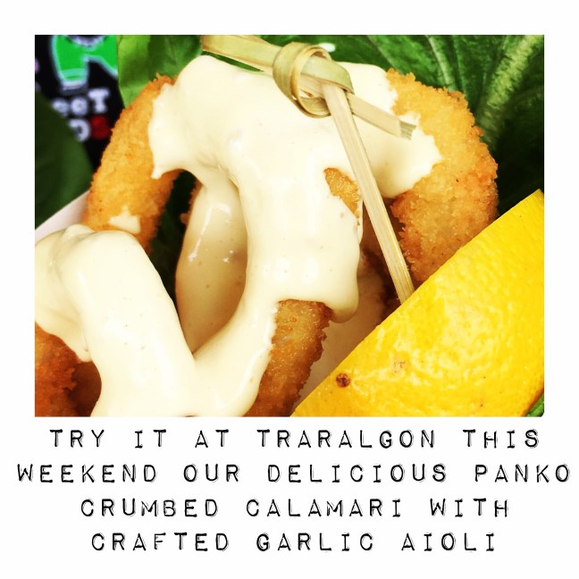 At the Traralgon Food Truck Carnival this weekend 3rd, 4th, 5th November don’t miss our delicious panko crumbed calamai with Emelia’s crafted garlic aioli or tartare sauce. Add beer battered Tassie chips and fresh cranberry coleslaw to complete the meal. Pop over to the bar for a wine, beer or whatever you fancy. Perfect!