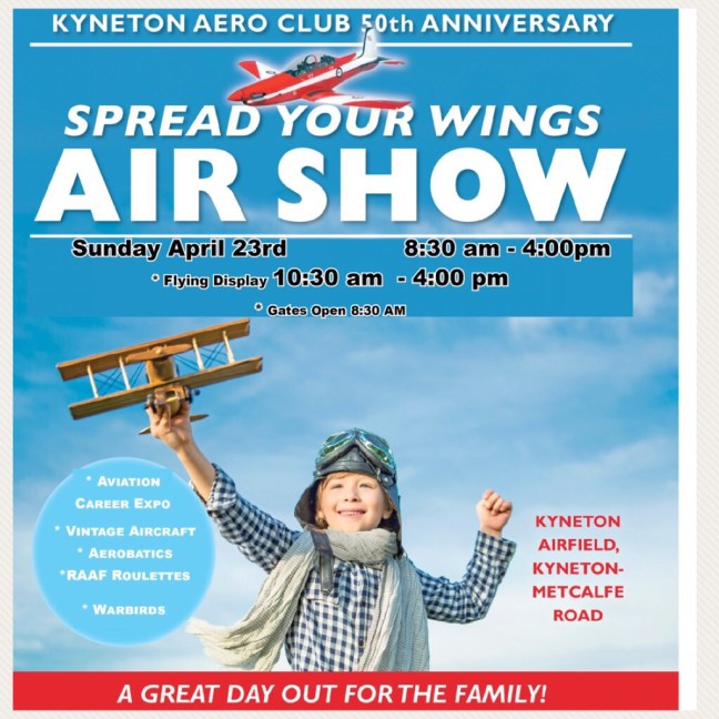 We’re really excited to be included in this great local event! Come along and find us there. Flying displays will include vintage and rare aircraft and a visit by the RAAF Roulettes. There will also be entertainment for children, a vintage car display and lots of vendors with great food vendors including us!! See you at the Kyneton Air Show 2017.
