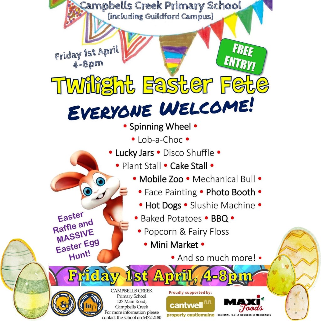 After which we are off to Campbells Creek to be part of the Campbells Creek Primary School’s Twilight Easter Fete from 4pm to 8pm – all welcome! Bring the family and join the MASSIVE Easter egg hunt! 🐰